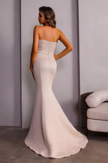 A breathtaking trumpet evening gown crafted from metallic jacquard available in elegant hues of champagne, navy, and rose gold. The sweetheart neckline and sleeveless design enhance the gown’s classic allure, while the fitted trumpet silhouette beautifully contours the body for a stunning, sophisticated look.
